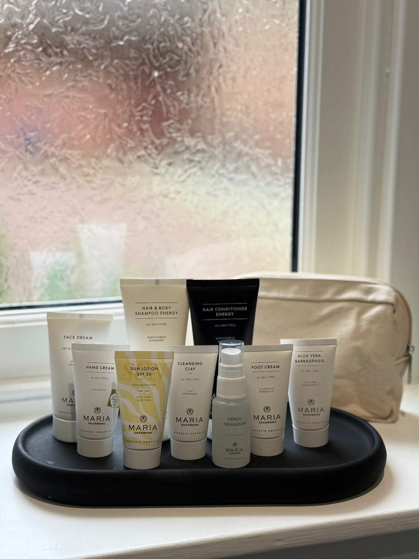 This beautifully curated Maria Åkerberg Organic Travel Set contains everything you need for a few nights away, all packed inside a stylish Organic Cotton wash bag and perfectly sized for travelling with hand luggage.